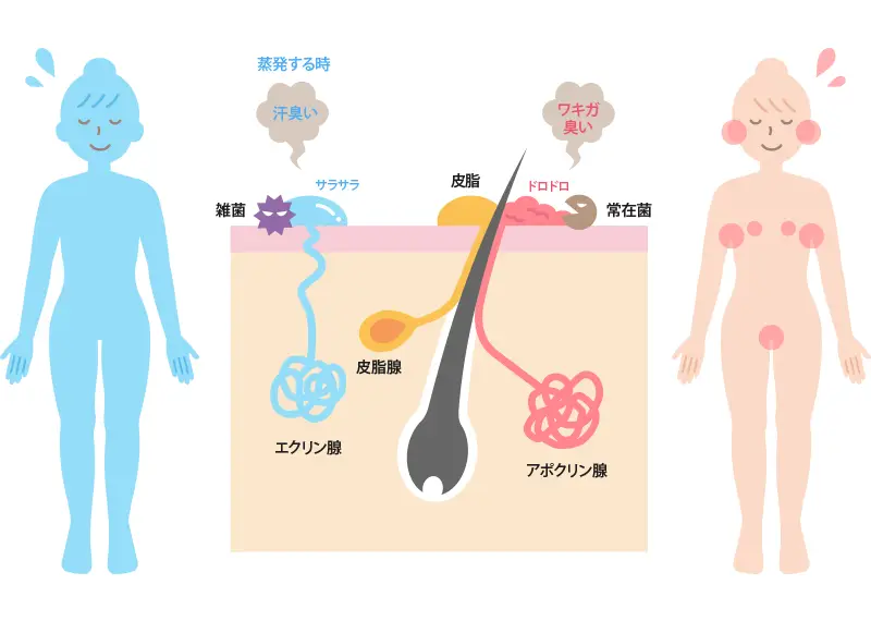 人の体には2つの汗腺「エクリン汗腺」「アポクリン汗腺」があります。エクリン汗腺からでる汗の成分の成分はほとんどが水分で臭いはありません。アポクリン汗腺からでる汗もほぼ無臭なのですが、皮脂腺から分泌される脂肪酸と一緒になり皮膚の常在菌(雑菌)により分解されると、臭いが発生します。これが独特の臭いになります。わきがの原因となるアポクリン汗腺は「脇」「陰毛」「乳輪周辺」等に存在します。