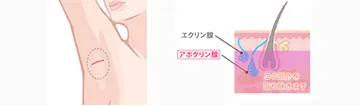 剪除法は、わきのシワに沿って3cmほど切開、ワキ全体を剥離し、目で確認しながら直接皮膚裏にあるアポクリン腺を切除する治療方法です。傷跡は時間が経つと、わきのシワに隠れます。