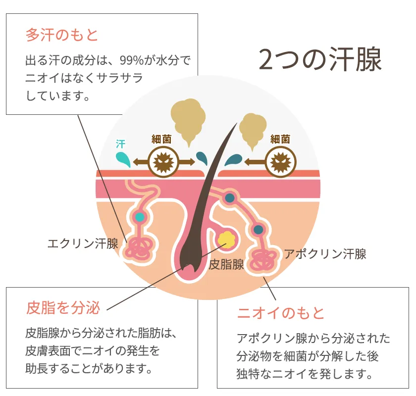 「多汗症」は、汗の量が多すぎる状態。エクリン汗腺という汗腺から出る汗はほとんどが水分なので、基本的にはにおいません。一方「わきが」は、アポクリン汗腺から出る汗が原因。脂質やタンパク質が多く含まれ、それを雑菌が分解することで特有のにおいが発生します。