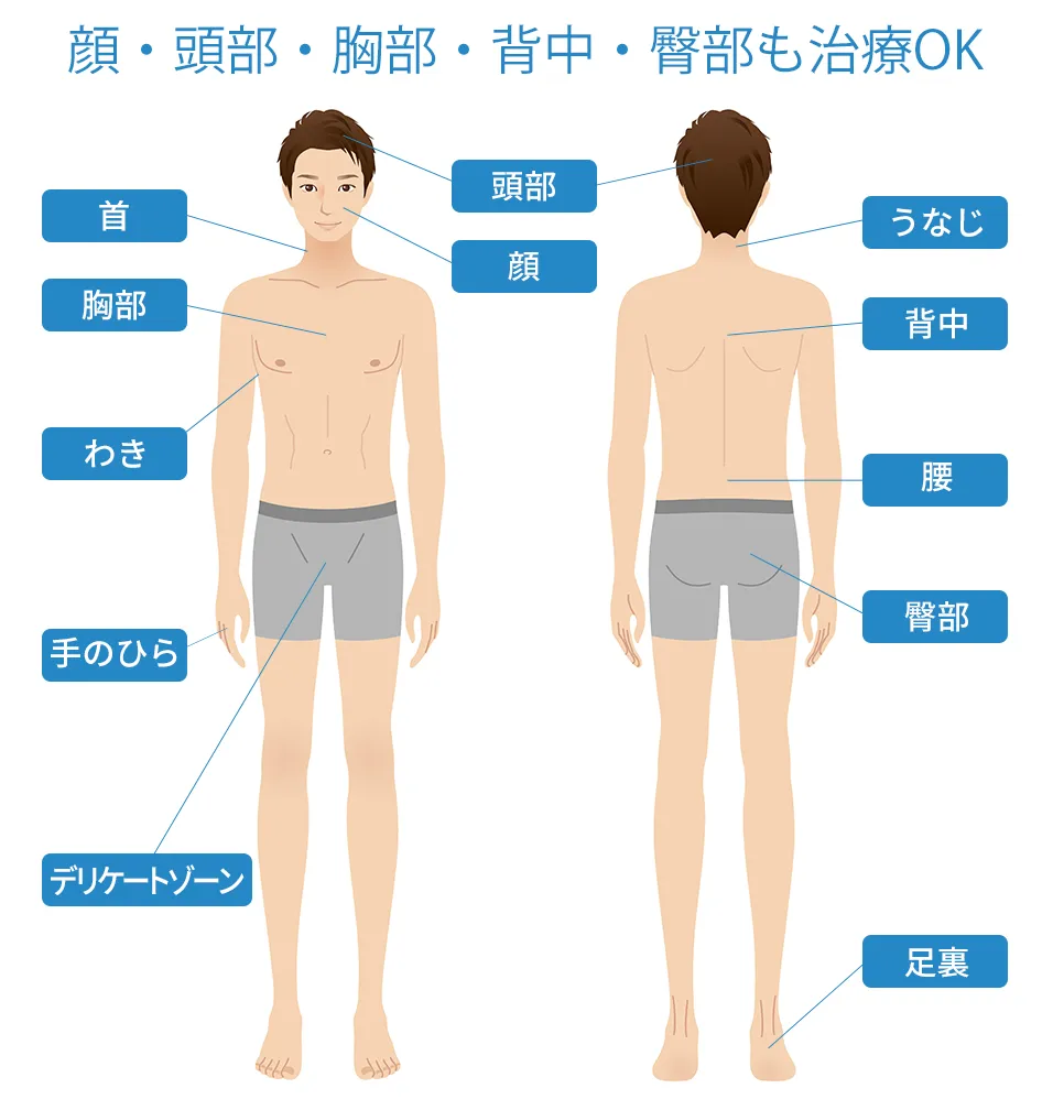 手、足、ワキ以外に、臀部(お尻)、額、前頭部(生え際)、頭部全体、鼻、鼻下、頬、口の下、顔全体、胸、胸の中央部のみ、背中、腰、デリケートゾーンなどの部位が治療できます。