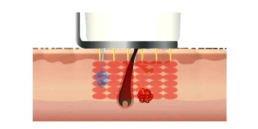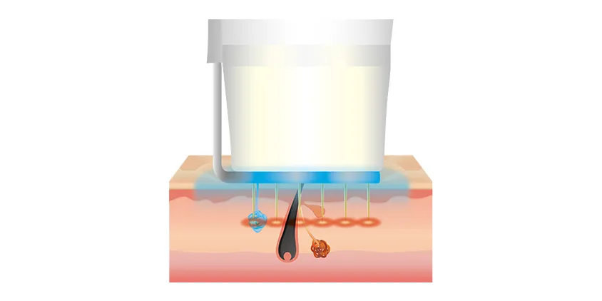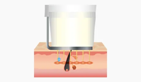 汗腺を狙って照射することにより、アポクリン腺は凝縮され機能を失い、エクリン腺は機能を抑制されます。