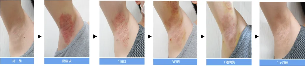 治療後は特にガーゼなどをせずにご帰宅いただけます。個人差はありますが2〜3日、赤みや腫れが出ることがあります。治療後は施術箇所にカサブタができますが、こちらは1週間ほどで治るものです。万が一赤みやカサブタ跡が悪化するようであれば、再度ご来院ください。